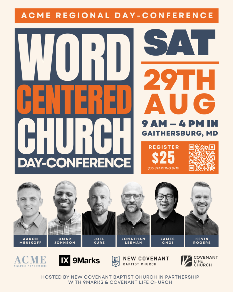 Join us for ACME Regional: Word-Centered Church Day-Conference, hosted by New Covenant Baptist Church, in partnership with 9Marks and Covenant Life Church. Our aim is to equip and encourage churches to recover a biblical vision of what it means to be a Word-centered church. The event is open to pastors, church leaders, and members of area churches.